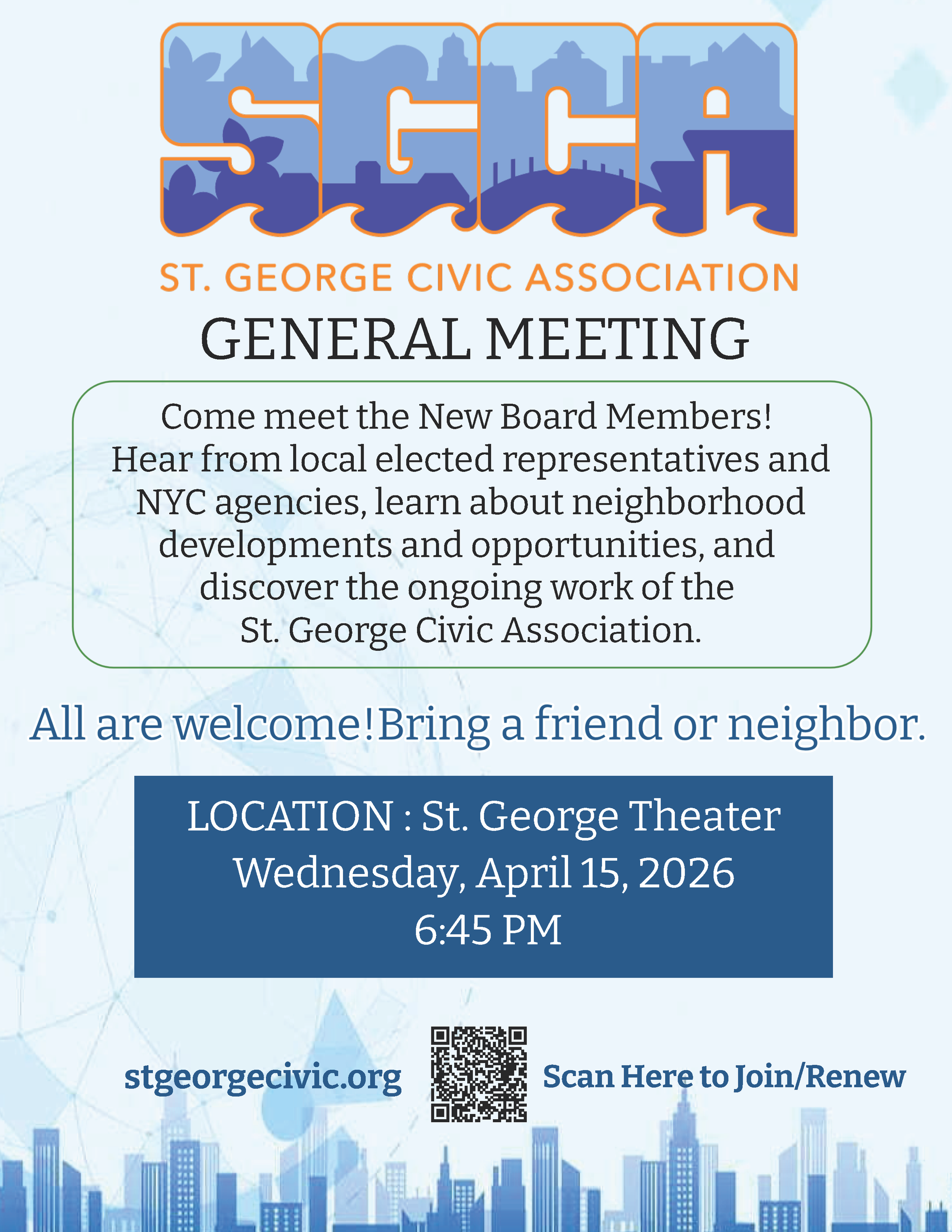 The St. George Civic Association is a volunteer neighborhood group that provides a collective voice to issues that affect our community. By working with local officials and elected representatives, we advocate for managed growth, public safety, better transportation (especially pedestrian safety and the ferry services), cared-for public spaces, and increased recreational, cultural, and retail amenities in our neighborhood. We strive to protect and improve the quality of life in St. George.